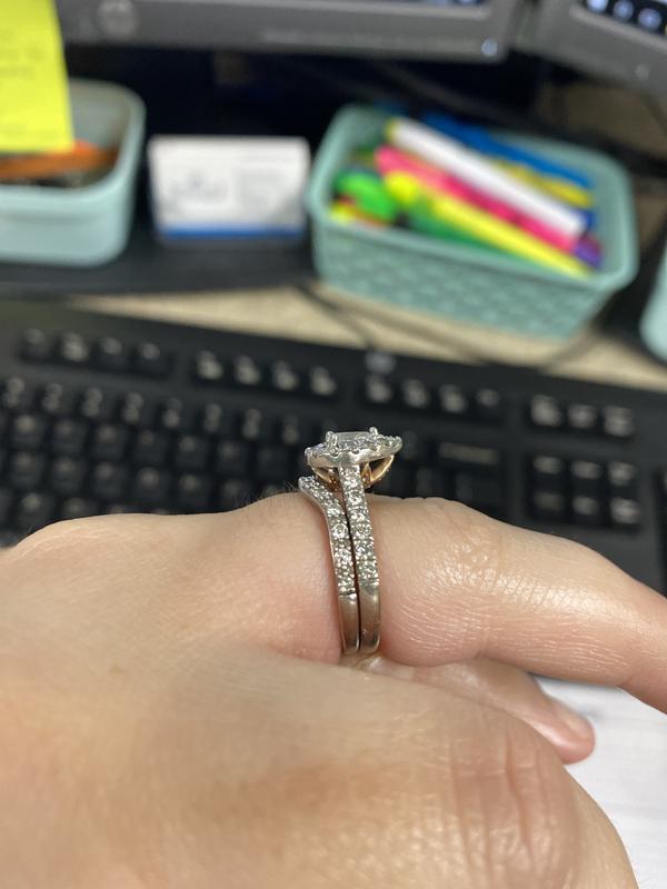 Fashioned in 10K white gold this band is lined with shimmering diamonds and features a slight contour at the center that fits beneath her solitaire engagement ring wrapping it in a sparkling.